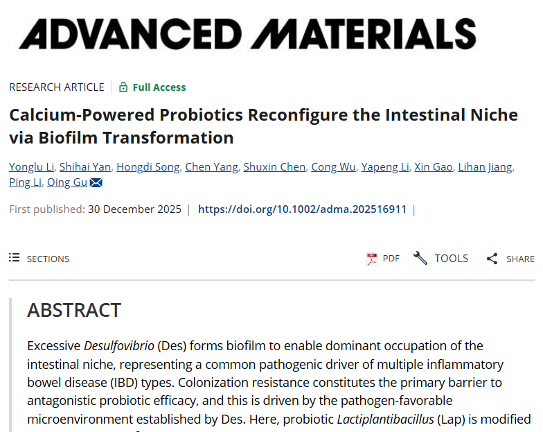近日,浙江工商大学食品与生物工程学院顾青教授团队在国际顶级期刊《Advanced Materials》(影响因子26.8)上发表了题为《Calcium-powered probiotics reconfigure the intestinal niche via biofilm transformation》的研究论文,提出一种基于“钙武装益生菌”的肠道菌膜转换新策略,为肠道致病菌感染及相关疾病治疗提供了创新性解决方案。浙江工商大学是该论文的唯一通讯单位,顾青教授为通讯作者,李永璐副研究员为第一作者。