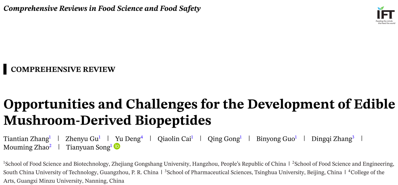 2025年7月18日,浙江工商大学食品与生物工程学院宋田源副研究员在国际顶级期刊《Comprehensive Reviews in Food Science and Food Safety》(中科院1区Top期刊,IF5=17.8)上发表了题为“Opportunities and Challenges for the Development of Edible Mushroom-Derived Biopeptides”的综述性论文。